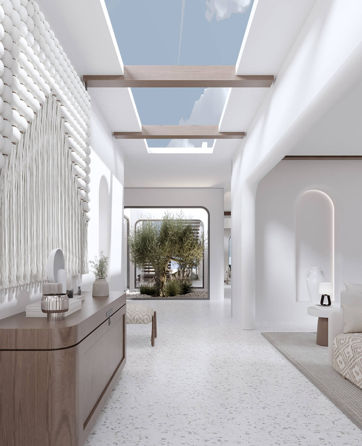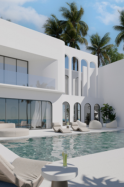 Discover the tranquility of our beach residential resort interior concept design, where soft pastel colors, natural materials like driftwood and seagrass, and large windows that bring in plenty of sunlight create an airy, coastal paradise.